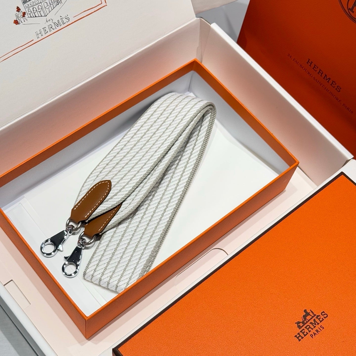25S HERMES BAG STRAP GRAY AND WHITE PATTERN 85 IN CANVAS SILVER HARDWARE