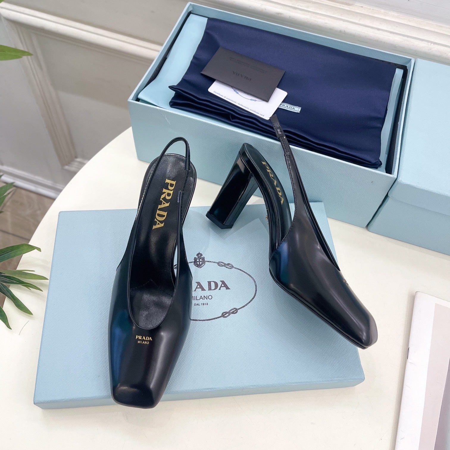 SQUARE TOE SLINGBACK PUMPS IN BLACK SMOOTH LAMBSKIN